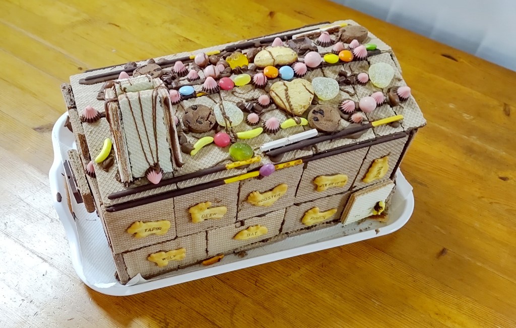 先週の金ちゃん食事会は、職場でウエハースが余った子がいて、お菓子のおうち作り大会となりました!トッピングを工夫したり、貼り付けに工夫したり、にぎやかな合同作業は見てるだけでも楽しかったです。たべっ子どうぶつやらココアシガレットやら、、、ドアの取っ手はバナナチョコですね〜。