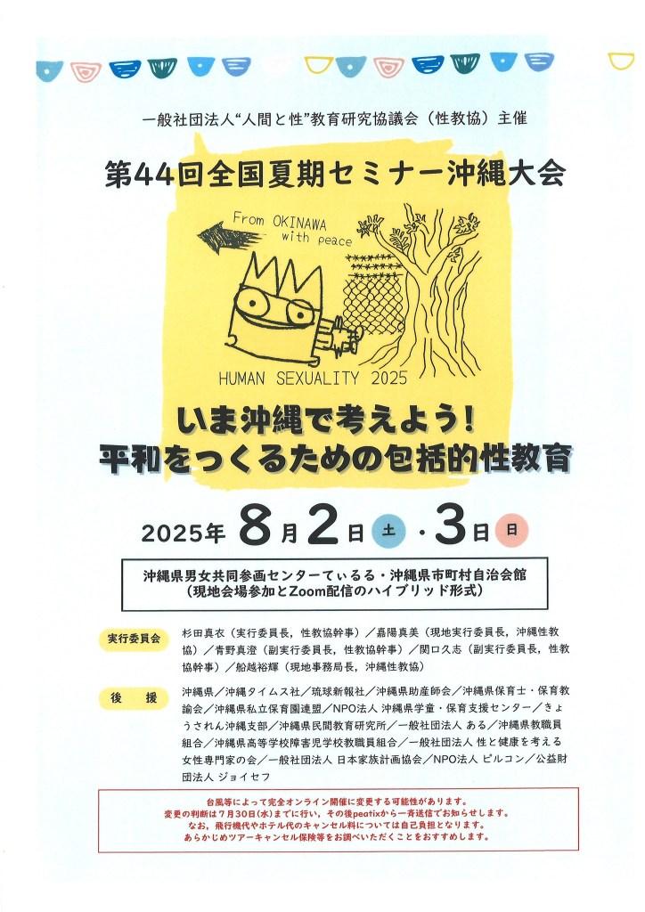 連携団体「”人間と性“教育研究協議会(性教協)」主催 【全国夏期セミナー】が、2025年8/2(土)~8/3(日)沖縄で開催されます。詳しくはこちらをご覧ください。
