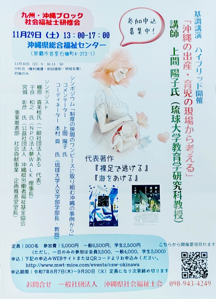 一般社団法人おにわの上間陽子先生の基調講演に続くシンポジウムにて、NPO法人夢WALK理事長の平良和之さん、公益財団法人沖縄県労働者福祉基金協会より宮城彰彦さん、棚原喜美枝がパネラーとして参加します。コーディネーターは琉球大学人文学部学部長の本村真先生です。