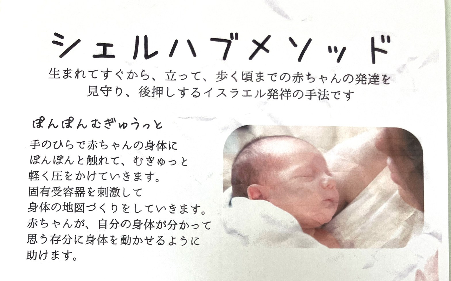 ばぁば保育園でシェルハブ・メソッド®の研修がありました。「ぽんぽん・むぎゅう®」の名前通り、「ぽんぽん」とやさしく触れて「むぎゅう」とやさしく圧を加えるタッチケアのような手法だそうです。 触れられる安心感やぎゅーっとされ続きを読む “ばぁば保育園研修”